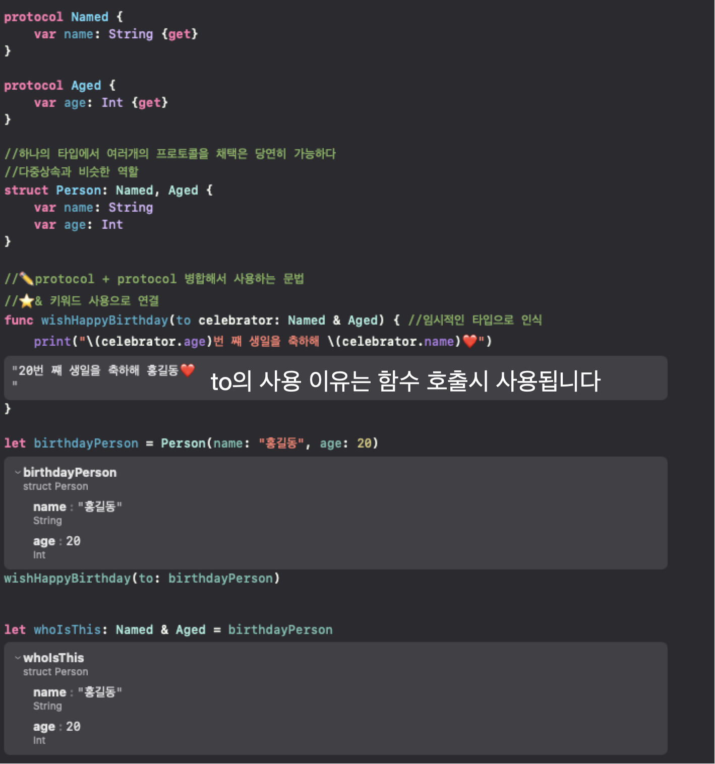 프로토콜의 구조체나 클래스 뒤에 여러개를 붙일 수 있습니다