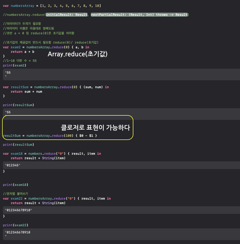 컬렉션의 모든 요소를 결합하여 단일 값으로 만드는 함수 초기값과 클로저를 사용해서 요소를 결합하는 방식