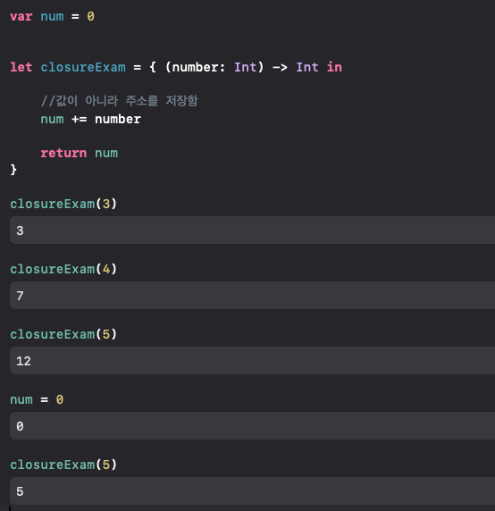 하지만 num이 지역변수더라도 클로저가 이 변수를 캡처해서 저장하기 때문에