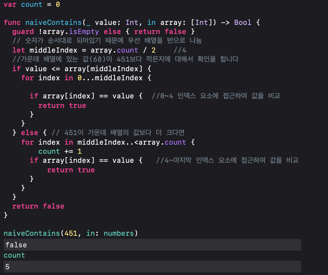 naiveContains함수를 만들고 호출했습니다