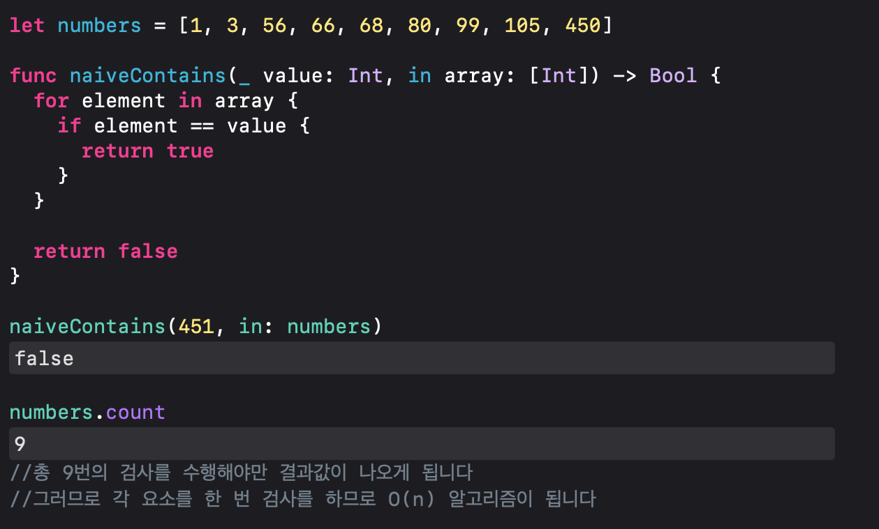 이 동작을 선형 시간 복잡도라고 합니다