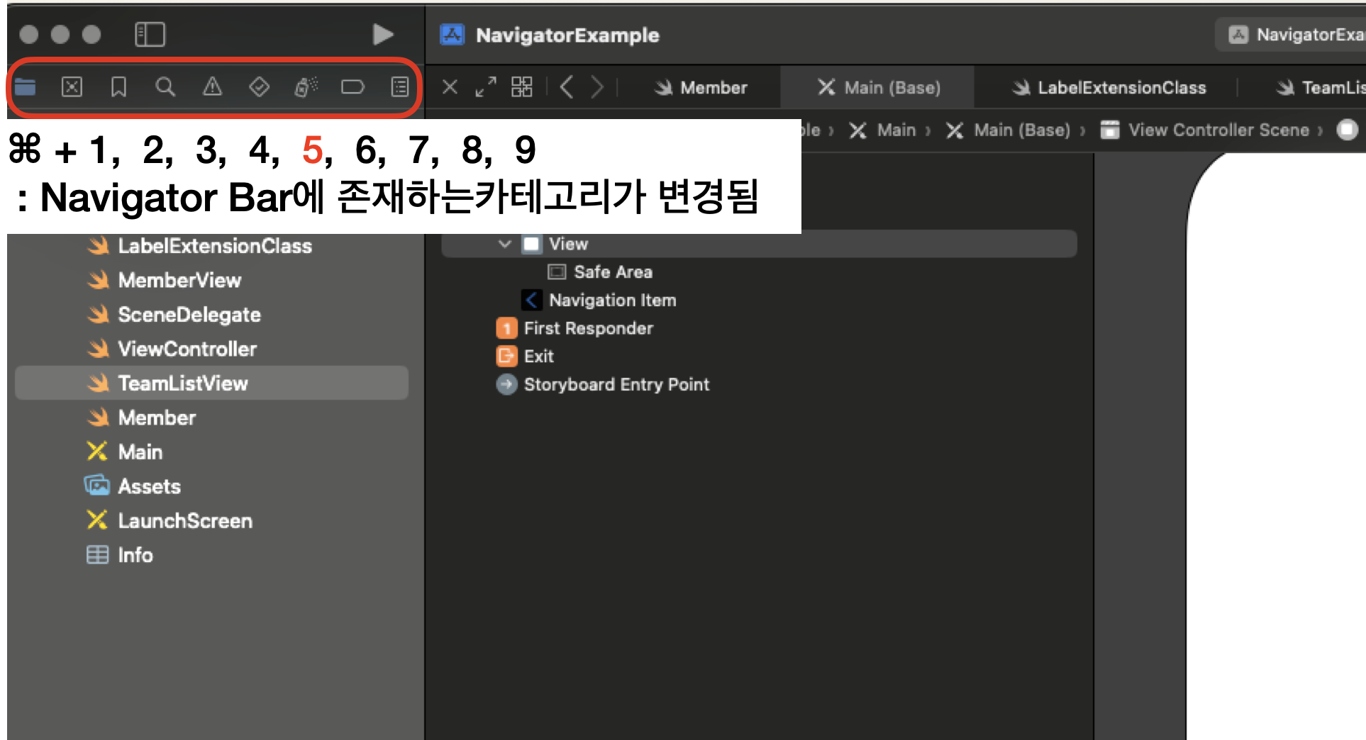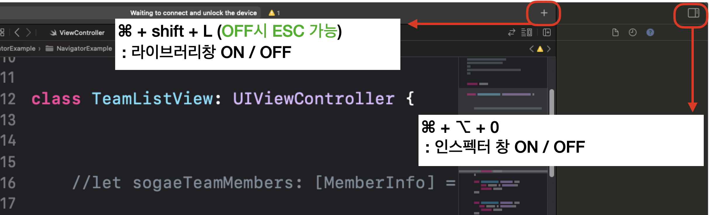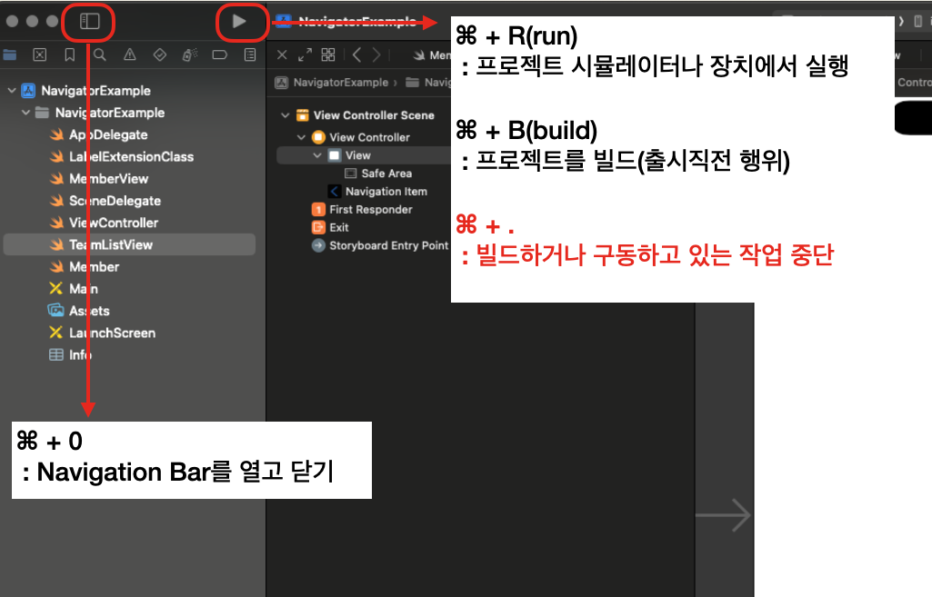 코드를 실행시키는 단축키 Command + R(un) : 프로젝트를 시뮬레이터나 장치에서 구동시킨다. Command + B(uild) : 프로젝트를 빌드한다. Command + . : 빌드하거나 구동하고 있는 작업을 중단한다. 시뮬레이
