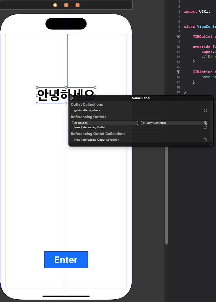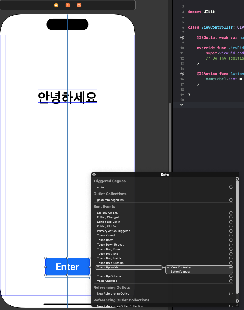 스토리보드와 코드를 연동하고 싶다면 객체를 누른 상태에서 컨트롤을 누르고 코드로 드래그 하시면