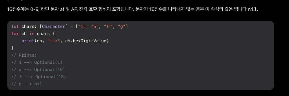 문자가 16진수 일 때 나타내는 숫자값입니다