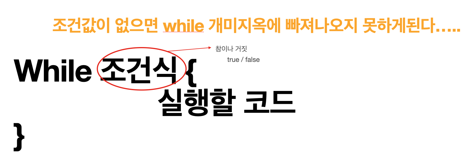 - while 반복문 : 주어진 조건이 false가 될 때까지 계속해서 일련의 구문을 반복 실행함(만약 조건이 없다면 무한 루프!!에 빠짐)
