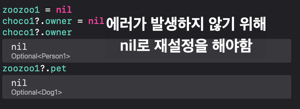 person?.printName() // 런타임 오류 발생: "Fatal error: Attempted to read an unowned reference but object <Person> has already been deallocated"