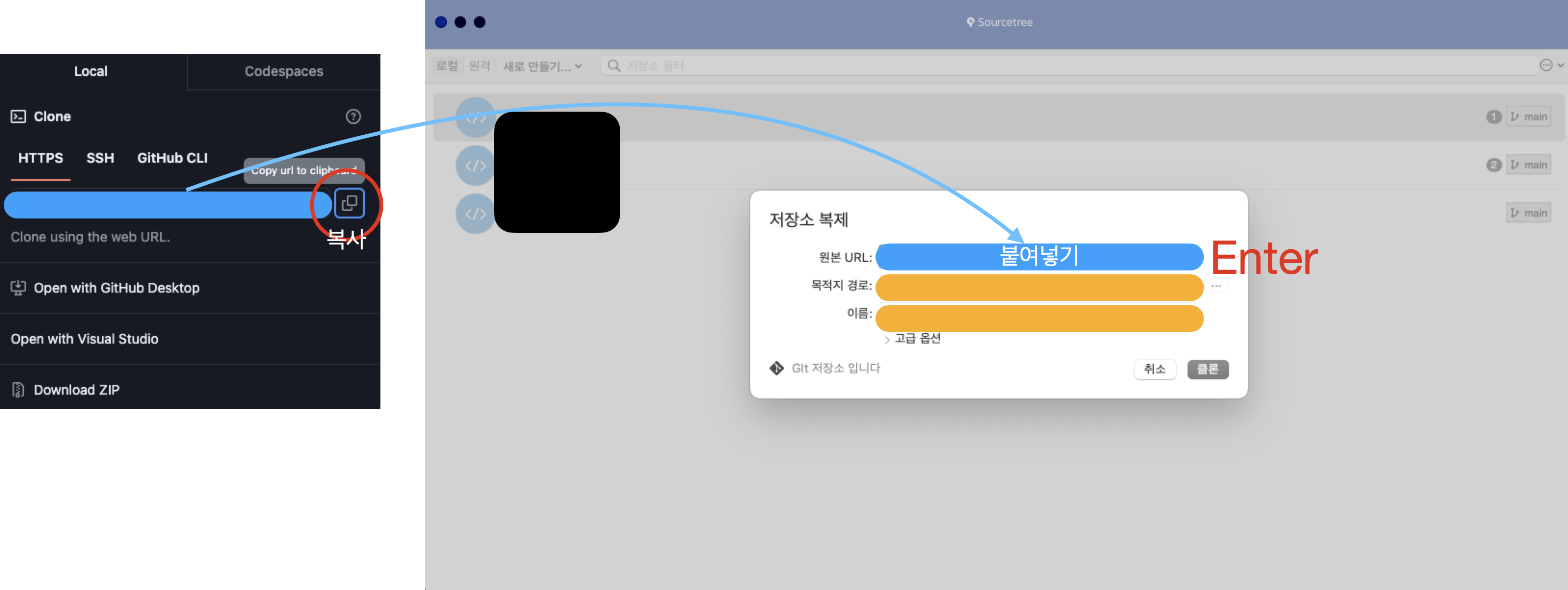 소스트리에서 원본 URL에 붙여넣기를 하고