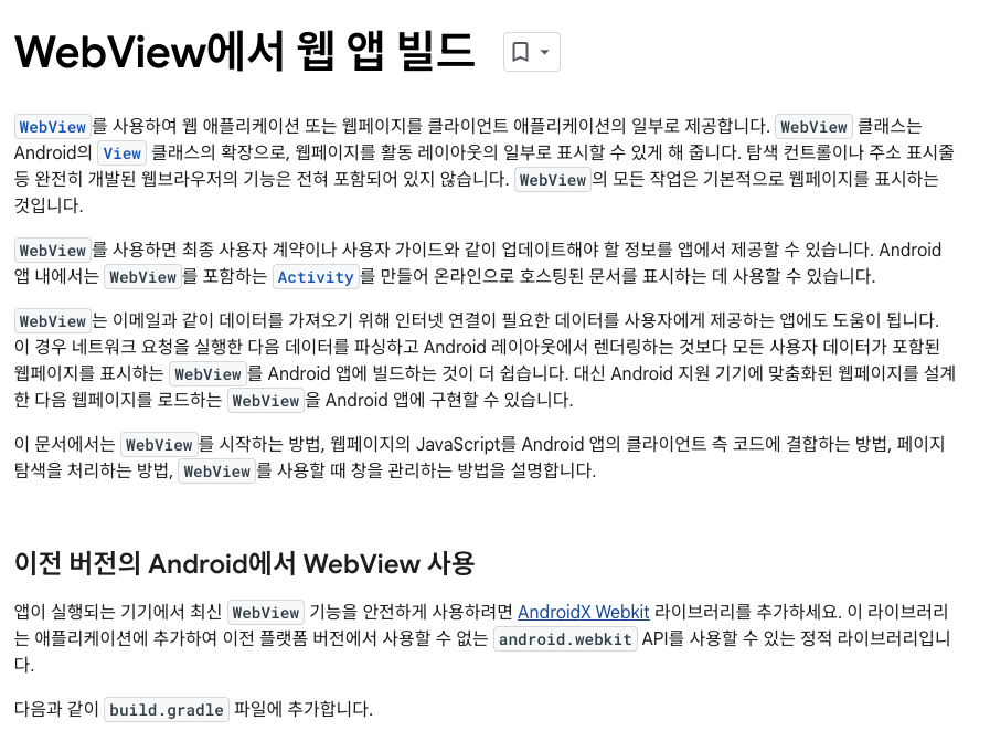 binding.webView.settings.apply { setSupportMultipleWindows(false) // 새창 띄우기 허용 setSupportZoom(false) // 화면 확대 허용 javaScriptEnabled = true // 자바스크립트 허용 javaScriptCanOpenWindowsAutomatically = false // 자바스크립트 새창 띄우기 허용 loadWithOverviewMode = true // html의 컨텐츠가 웹뷰보다 클 경우 스크린 크기에 맞게 조정 useWideViewPort = true // html의 viewport 메타 ..
