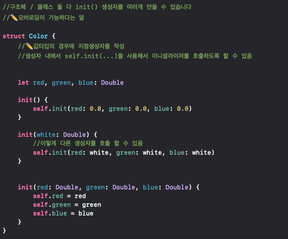 안녕하세요!저번에 이어서생성자에 대해서 좀 더 자세히 알아보고자 합니다저번시간에 정말 기초적인걸 다뤘으니 궁금하시다면한 번 읽고 오시는걸 추천드립니다~! 우선 구조체의 생성자에 대해서 정리하는 시간을 가지려고 합니다 구조체의 생성자는 클래스에 비해서 비교적 간단합니다 구조체는 init() 생성자내부에 self.init(...)으로 오버로딩된 함수 호출이 가능합니다 이렇게 이미지를 보면 init(매개변수 red, green, blue)함수를 오버로딩한 함수에서 호출하는걸확인할 수 있습니다 다음으로 클래스 생성자에 대해서 알아보고자 합니다 클래스는 구조체보다 좀 더 다양하게 생성자를 만들 수 있습니다 클래스는 지정생성자와 편의생성자가 있습니다 쉬운 예제 하나를 보고 설명하도록 하겠습니다 지정생성자는..