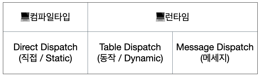 안녕하세요오늘은 공식문서에는 없지만Method Dispatch에 대해서 알아보고자합니다 Method Dispatch| 공식문서에는 없지만 이걸 남기는 이유는 컴퓨터가 동작하는 방식에 대해서 더 잘 이해하기 위해서정리했습니다 :) 우선 내가 알고있는 지식이라곤 컴파일 타임은 정적 타입 검사일 때런타임에는 동적 타입 검사이고컴파일은 기계어로 이해할 수 있는 0과 1로 변환되는 과정이며런타임은 컴파일을 거친 코드인 기계어가 사용자가 사용하는 순간이라고 알고 있었답니다 강의에서 자세하게 풀이해줬기 때문에좀 더 세세하게 나뉘고 있고 런타임과 컴파일 타입에서 일어날 수 있는 문제점에 대해서 한 번 더 고찰할 수 있었던 강의가 아닌가 싶었습니다 그리고 메서드 디스패치는 간단히어떤 메서드들의 특징에 대해서 다루는 시간..